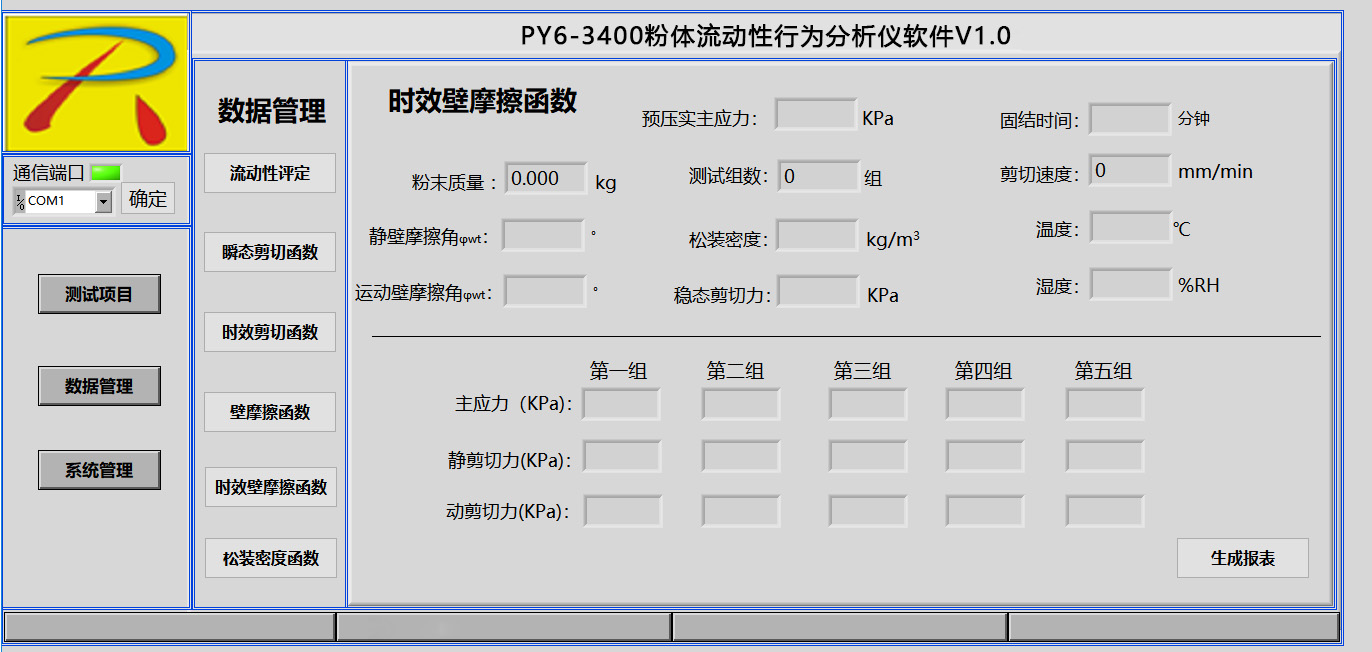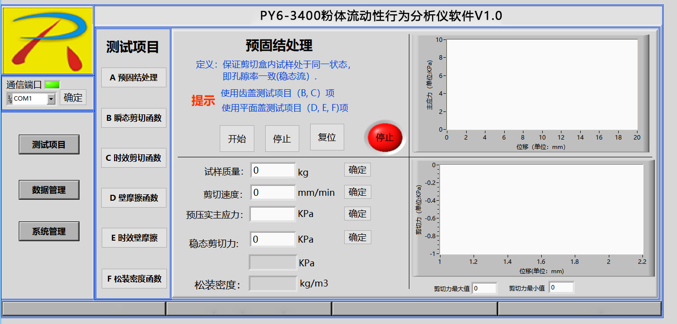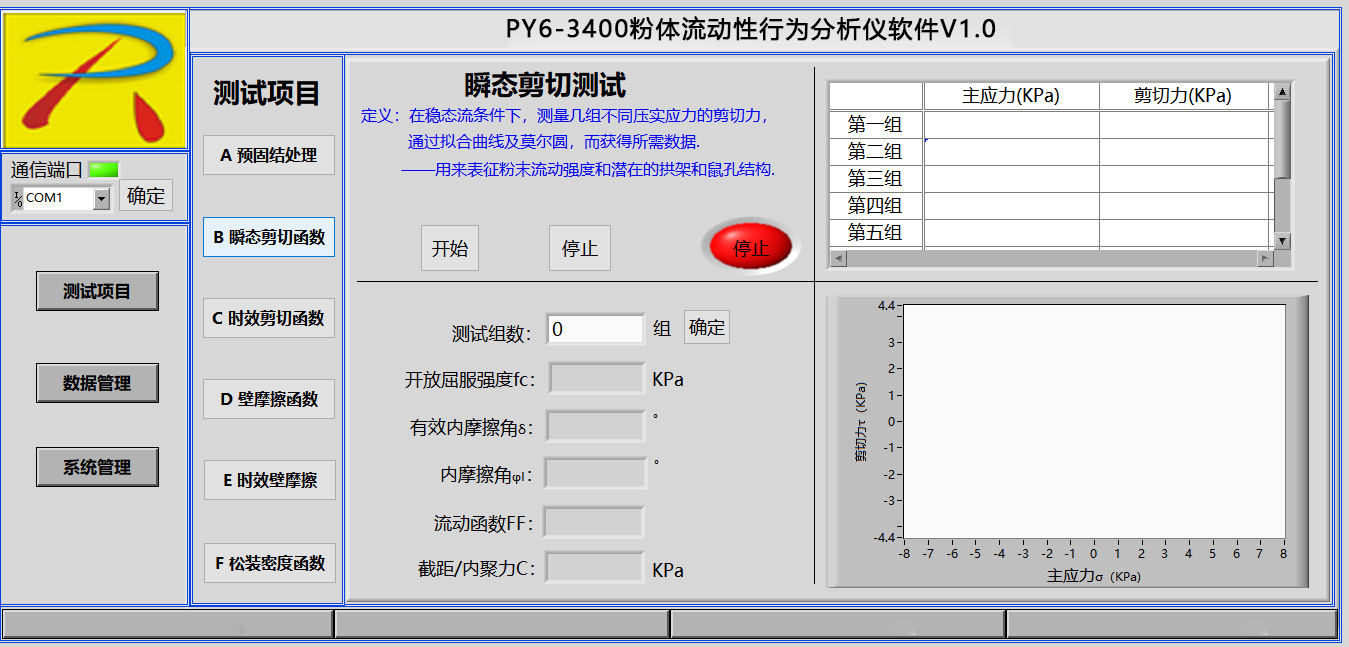 分析和测试如下数据:莫尔应力圆、内摩擦角、主应力、剪切力、屈服轨迹、稳态流、流动函数、开放屈服强度(无侧限屈服强度)、内摩擦时间角、时效屈服轨迹、堆积密度、密度轨迹、壁摩擦角、附着力、壁剪切力、壁应力、壁轨迹、运动摩擦角、静态摩擦角、料仓设计的料斗半顶角、卸料口径、流与不流判定、流动因子、初始抗剪强度(内聚力)等数据分析.